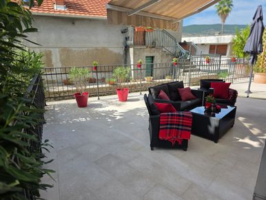 The terrace is the standout feature of the Sea Vibes apartment — a truly expansive outdoor living space surrounded by greenery and complete privacy.