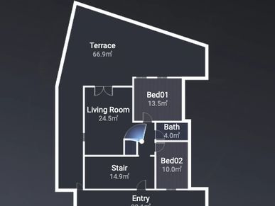 The 24.5 m² living room, kitchen, and dining area form the core of the layout, designed in an open-concept style that enhances spaciousness and interaction. This space opens directly onto the expansive terrace, which acts as an outdoor extension of the floor plan. The terrace’s size and shape provide opportunities for multiple zones — lounge seating, outdoor dining, sunbathing, or even an open-air workspace.